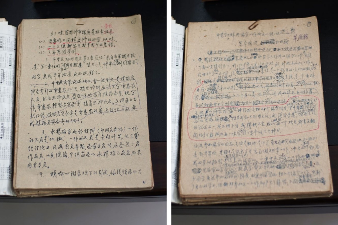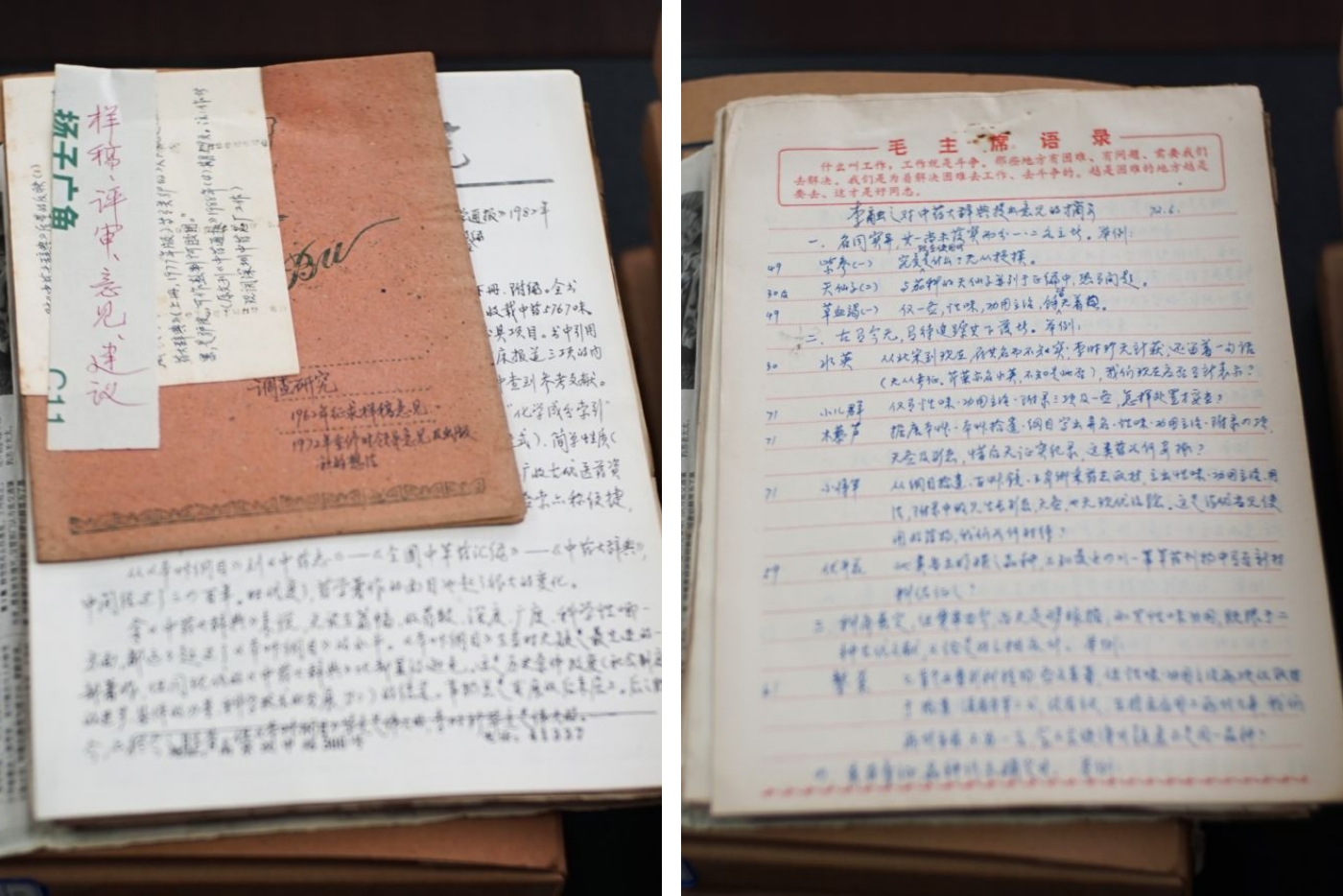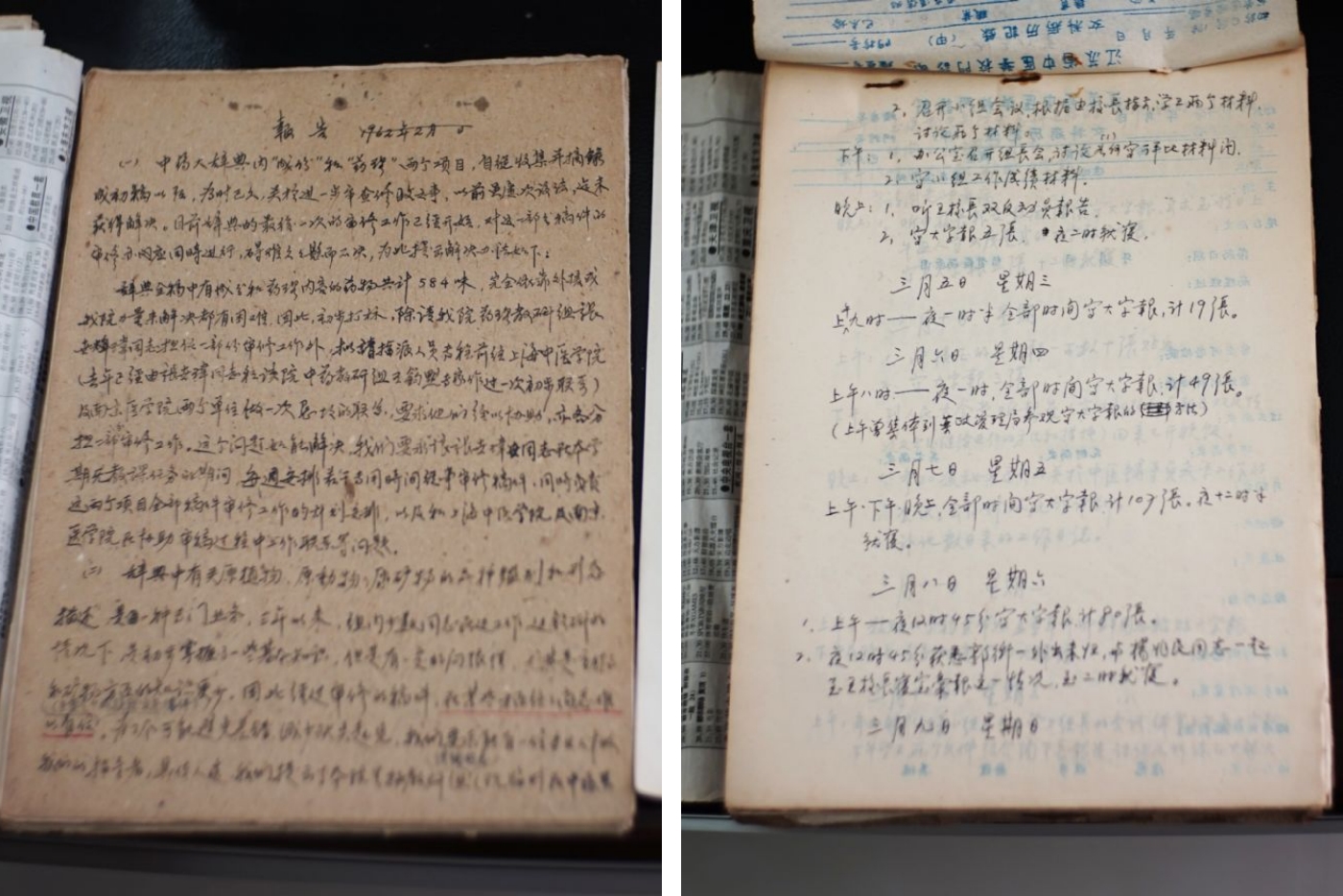 呈现在全体党员面前反复修改的手稿和记录详细的工作日志等材料,令人震撼之余又让人深深感动。在没有电脑的年代,全靠手写,有的是毛笔写的,反复修改,反复增删。那时纸张紧缺,还是用的草纸,和一面已经用过的废纸,可见编写工作异常艰辛,今日随手可查得到的中药资料是前辈用汗水付出而来,这令手稿上工整的字体也变得更加珍贵。