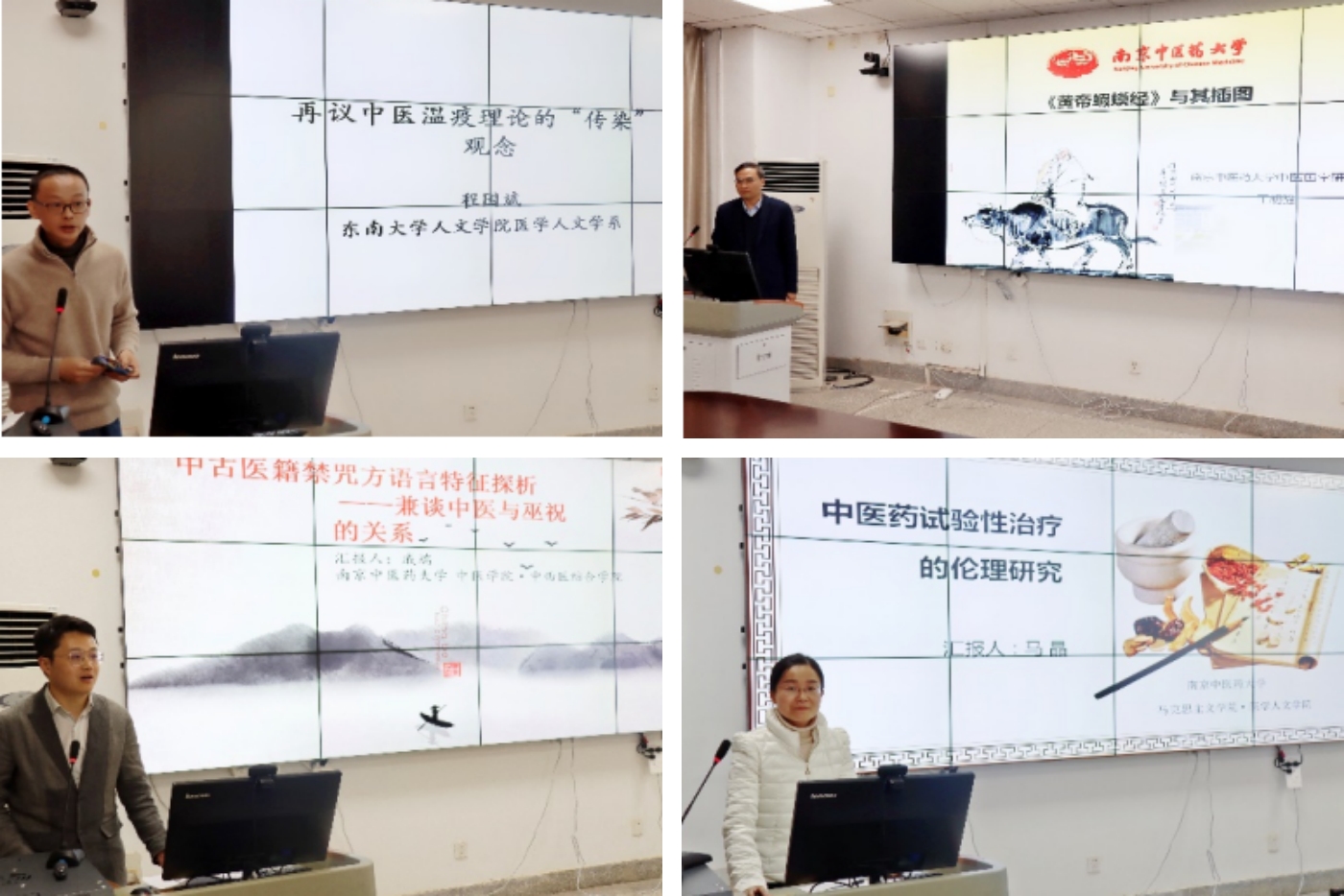 第二阶段是学者交流。上半场由中医国学研究所副所长范崇峰副研究员主持,两位学者进行了交流报告:东南大学人文学院医学人文学系主任程国斌副教授《再议中医瘟疫理论的“传染”观念》、王明强教授《〈黄帝蝦蟆经〉与其插图》。对于两位学者的学术交流,陈仁寿所长和周群教授分别进行了精彩点评。下半场由南京中医药大学中医学院•中西医结合学院中医文史教研室主任张继副教授主持,二位学者进行了交流报告:戚端老师《中古医籍禁咒方语言特征探析——兼谈中医与巫祝的关系》、马晶老师《中医药试验性治疗的伦理研究》,对于两位学者的学术交流,沈澍农教授和程国斌副教授分别进行了精彩点评。