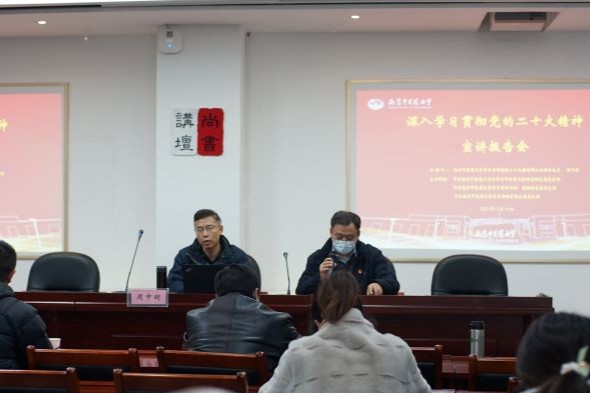 12月14日下午,中医药文献研究所直属党支部、图书馆博物馆直属党支部、体育部直属党支部在图书馆309报告厅开展党的二十大精神联学活动。校巡讲团成员、马克思主义学院·医学人文学院马克思主义中国化教研室主任、江苏省一流课程负责人周中明作宣讲报告。会议由中医药文献研究所直属党支部书记施华平主持。