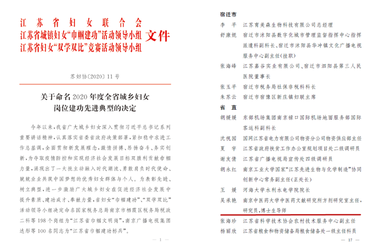 近日,江苏省妇女联合会、江苏省城镇妇女“巾帼建功”活动领导小组和江苏省妇女“双学双比”精神活动领导小组印发《关于命名2020年度全省城乡妇女岗位建功先进典型的决定》(苏妇协〔2020〕11号),我院教师吴承艳获“江苏省巾帼建功标兵”称号。据悉,本次共命名100名“江苏省巾帼建功标兵”,其中在宁高校仅有4人获此称号。
